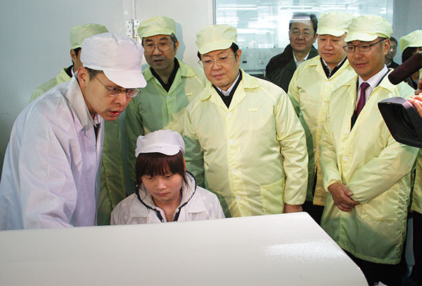 看到展廳中“北部灣單晶硅第一棒”、“創(chuàng)新科海量存儲(chǔ)器”等高端展品,聽到冠捷科技、朗科科技等企業(yè)已經(jīng)進(jìn)駐園區(qū),王兆國(guó)十分高興,連聲贊好,對(duì)中電北海產(chǎn)業(yè)園的發(fā)展戰(zhàn)略、創(chuàng)新模式和建設(shè)發(fā)展速度表示贊許;對(duì)中國(guó)電子堅(jiān)持創(chuàng)新、搶抓發(fā)展機(jī)遇,收購(gòu)冠捷、搶占北部灣發(fā)展先機(jī)等舉措給予肯定。王兆國(guó)指出,改革開放初期企業(yè)發(fā)展主要是靠土地優(yōu)勢(shì)和勞動(dòng)力優(yōu)勢(shì),而現(xiàn)在要靠科技優(yōu)勢(shì)和服務(wù)優(yōu)勢(shì),誰(shuí)把握了科技優(yōu)勢(shì)和服務(wù)優(yōu)勢(shì),誰(shuí)就能夠贏得發(fā)展先機(jī),希望中電集團(tuán)學(xué)習(xí)、借鑒國(guó)際知名IT企業(yè)的發(fā)展經(jīng)驗(yàn)和失敗教訓(xùn),在自主創(chuàng)新及核心技術(shù)研發(fā)上實(shí)現(xiàn)突破,不斷增強(qiáng)和提升市場(chǎng)競(jìng)爭(zhēng)力,為國(guó)家電子信息產(chǎn)業(yè)的發(fā)展做出更大的貢獻(xiàn),同時(shí)繼續(xù)發(fā)揮央企的引領(lǐng)作用,為地方經(jīng)濟(jì)建設(shè)發(fā)展做出更大的貢獻(xiàn)。