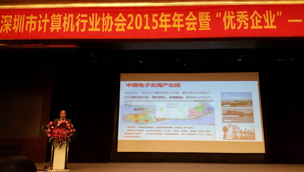 2016年1月7日,深圳市計算機行業(yè)協(xié)會2015年年會隆重舉行,受協(xié)會之邀,中國電子科技開發(fā)有限公司總經(jīng)理、北海市電子信息行業(yè)協(xié)會會長賀海華率中電科技旗下北海、西安、溫州園區(qū)參加盛會,賀海華與會員單位分享交流了中電科技建設產(chǎn)業(yè)園區(qū)板塊經(jīng)驗,介紹推介了各地方園區(qū)產(chǎn)業(yè)特點,衷心希望與各會員企業(yè)開展產(chǎn)業(yè)合作,歡迎來園區(qū)調(diào)研、拓展業(yè)務,賀海華的精彩講解得到了參會嘉賓們的高度認同與熱烈回應。盛會間隙,北海、溫州、西安園區(qū)相關負責人和意向投資企業(yè)進行了暢談,現(xiàn)場氣氛活躍,很多企業(yè)對中國電子投資建園的地區(qū)表達了合作意向,愿意進一步加強了解與合作,其中,北海以獨特的區(qū)位優(yōu)勢、產(chǎn)業(yè)政策、生態(tài)優(yōu)勢,備受多家深圳企業(yè)重點關注。