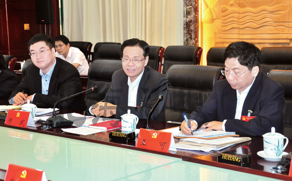圖片說明:11月21日下午,陳武、王可、李延強(qiáng)同志參加自治區(qū)第十一次黨代會北海市代表團(tuán)全體會議,與大家一起審議彭清華同志代表中國共產(chǎn)黨廣西壯族自治區(qū)第十屆委員會所作的報(bào)告。北海日報(bào)記者 扶建邦 攝